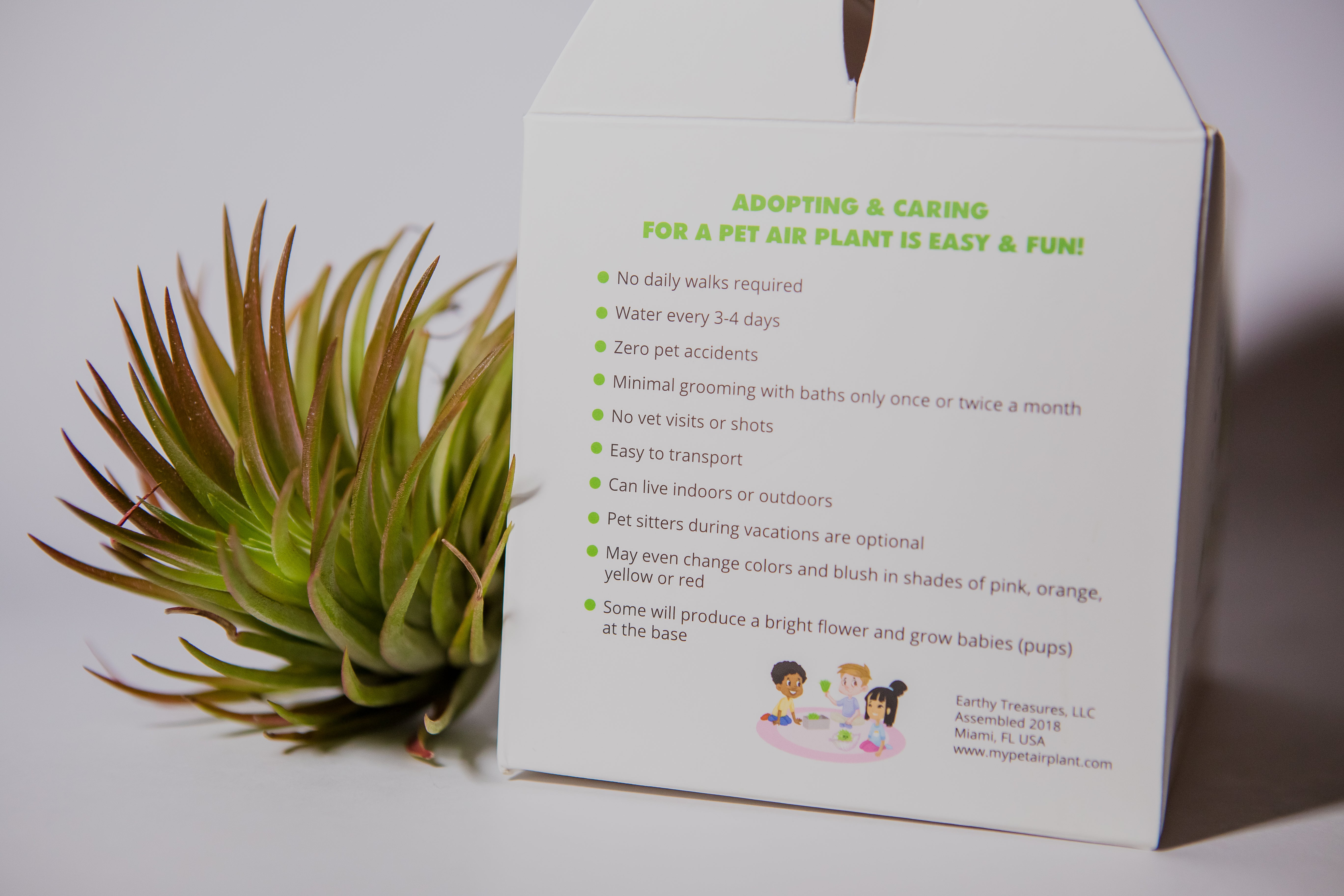 Pet Air Plants are very special, real, LIVE plants from the Genus Tillandsia L. (also affectionately known as Tillies). Air Plants make wonderful pets for kids. These compact, quiet remarkable plants require minimal care that is at just the right level for a child to be able to perform all by themselves. Through pet air plant adoption a child can learn responsibility as they care for these plants, begin to see plants and nature in a whole new way, and possibly develop a lifelong love and appreciation for plants and nature as a whole. With proper care and attention, they can experience the magic of a plant's life cycle as they watch these remarkable little “pets” flourish, blush, flower and produce babies (pups)!